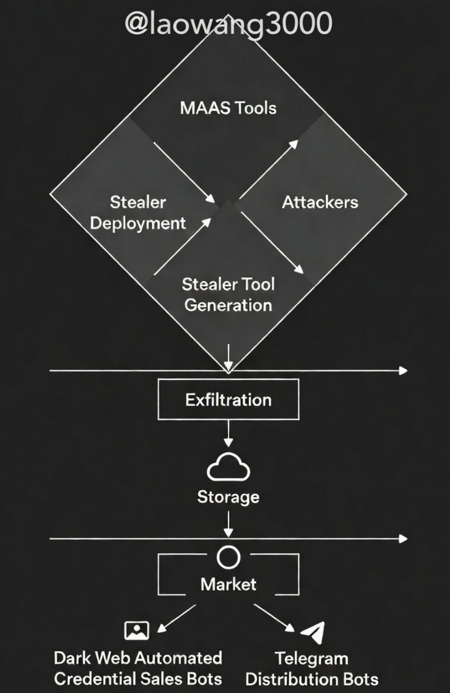 2025年stealer logs流通周期缩短至数小时:感染→Telegram Bot外传→云频道首发→Tor市场/订阅变现。MaaS模式让攻击门槛低至几百美元订阅面板,Lumma Stealer等主导市场,针对浏览器扩展、桌面钱包、剪贴板、关键词文件扫描的模块化设计,直接瞄准Web3用户"钱包杀手"。
