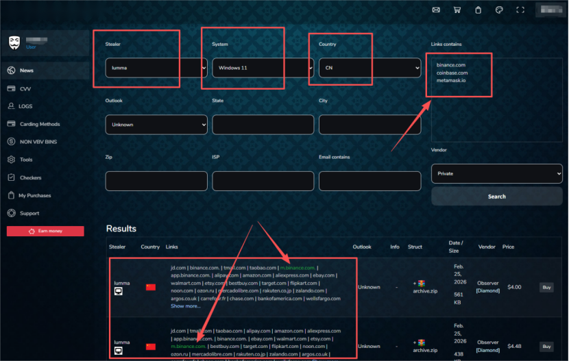 筛选条件一组合,就得到:被Lumma感染、使用Win11、在币安/Coinbase/MetaMask活跃的中国用户。他们的交易所账号密码、种子短语、私钥、浏览器cookies,甚至关联银行卡信息,全打包成"数据包"。